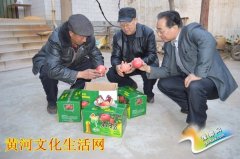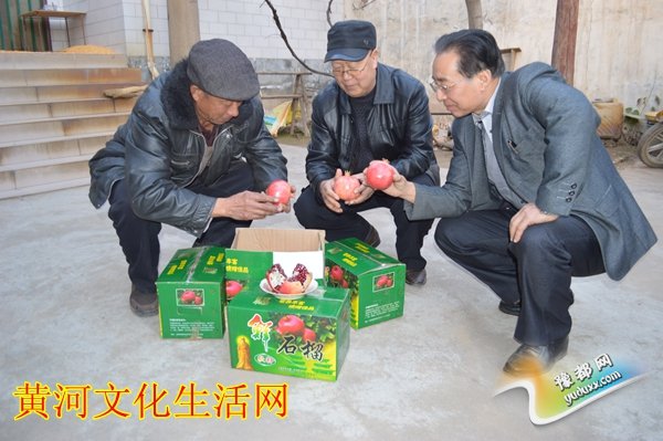 宝市新农村益联电子商务公司董事长王典谋(中)监事李岚(右)在种植石榴大户建孟敦(左)家观看石榴质量 摄影/郭海