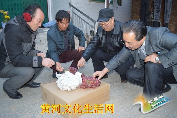 东水头村东塬红提葡萄合作社郭项斌(左一)西水头村红提种植大户建稳丰(左二)给益联公司领导介绍红提质量