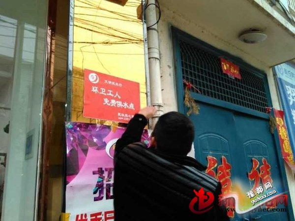 在民权县的很多商店门前都贴着一个可爱的红色标识,这些商店就是民权爱心家园志愿者联合爱心商家专门为环卫工设立的“免费供水点”,环卫工人们只要看到挂着红色标志的店铺,就可以进去喝口水,歇歇脚。