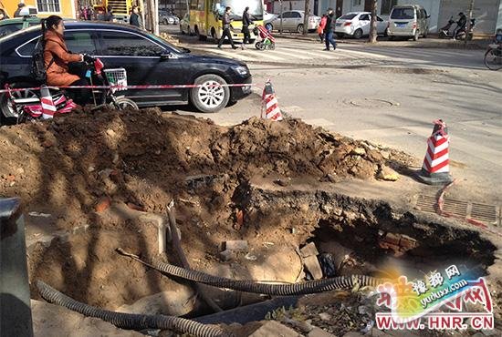 2日9时许,文化宫路汝河路交叉口西南角路面开挖大坑的现场,约1米深的大坑里暖气管道已修复完毕。大坑周边设置有警示标示,但在现场已看不到有工人施工。