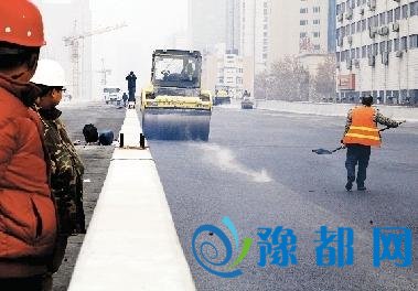 前日下午,农业路文化路口附近的高架主桥上,20多名工人正在紧张地进行沥青摊铺作业。