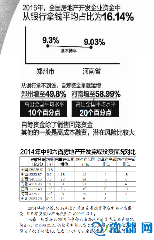 根据最新掌握的2015年中部六省房地产开发完成投资情况,河南以4818.93亿元,仍然居中部六省之首,且增速列第2位,比安徽省多投了将近400亿元。从中可以看出,郑州明年不缺预售房。