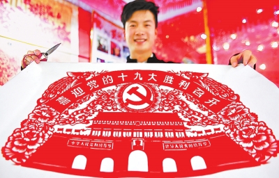 10月15日,洛阳市“90后”剪纸艺人畅杨杨,创作出“喜迎党的十九大胜利召开”主题剪纸作品,用自己独特的方式献礼十九大。⑨6黄政伟摄