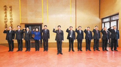 11月5日上午,省委书记谢伏瞻和省委常委在焦裕禄同志纪念馆宣誓厅面对党旗一起重温入党誓词。⑨6本报记者董亮摄