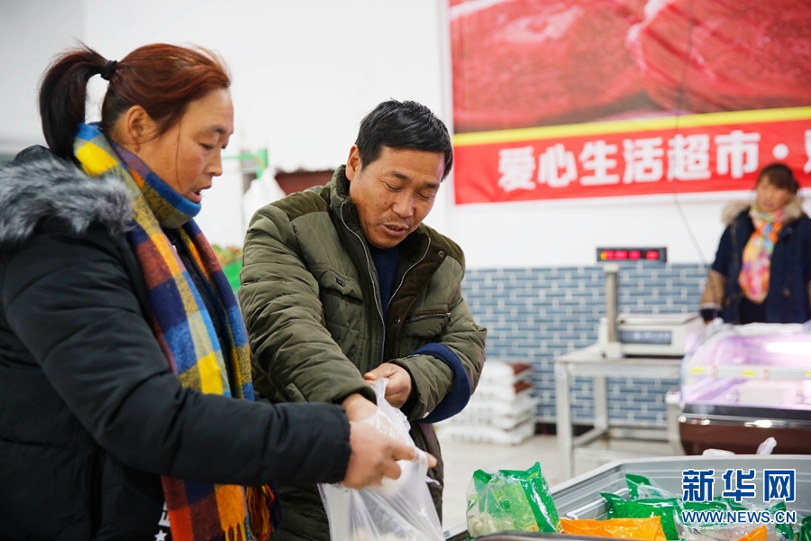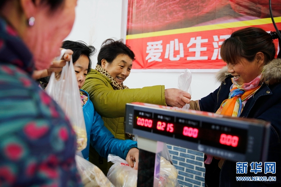 1月19日,位于河南省宝丰县观音堂林站异地扶贫搬迁点余家花苑新村的“爱心超市”里人潮涌动。贫困群众可用鸡蛋、花椒、蜂蜜等物品在超市兑换米、面、油、衣、被等基本生活必需品,也可在这里购买到低于市场价5%-10%的商品,部分困难群众还可在超市打工,有效缓解当地贫困群众的生活困难。