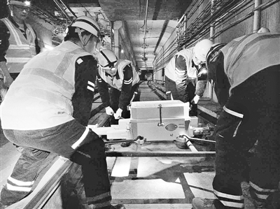 记者看到,一个像银灰色铁盒子样的转辙机,由四个维修工人抬着,从地铁站台进入隧道内。虽然他们都是年轻小伙儿,但仍显得吃力。原来,每一个转辙机都有180公斤重。到达指定的转辙机位置时,大家都已经气喘吁吁。