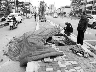 市政人员告诉记者:损毁的路灯正是那天晚上发生车祸撞的,车撞倒了一棵树苗后才停下。