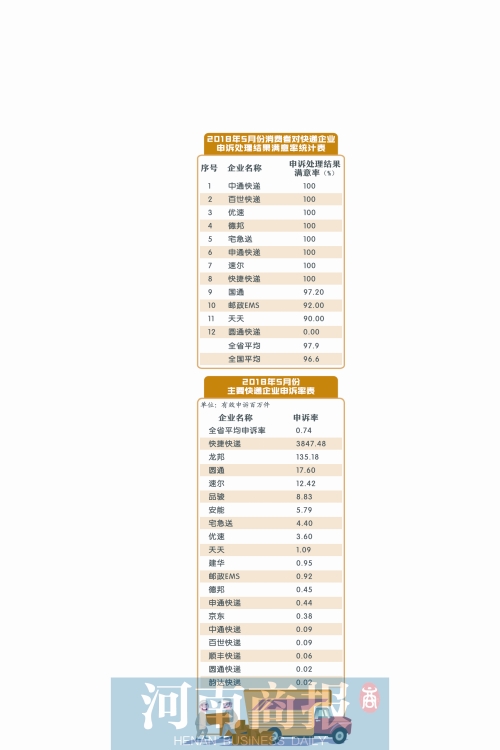 天天在网上买买买,经常都有快递收,可是,小伙伴们,你知道河南哪家快递企业最靠谱吗?业内人士称,“靠谱”与否可以从消费者申诉率和申诉处理结果满意率来预判。7月14日,河南商报记者从省邮政管理局获悉,今年5月份,全省有8家快递企业的申诉处理结果满意率为100%。这些企业都是谁?是哪些因素影响了消费者对快递企业的评价?