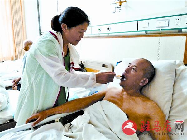“成林,我今天早上给你煮了米粥,里面还有胡萝卜和牛肉,你一定喜欢吃。”昨日上午,记者在市第二中医院内科病房里,见到了正在给前夫喂饭的王新红。每喂一口饭后,她都细心擦去前夫嘴角流出的饭渣。