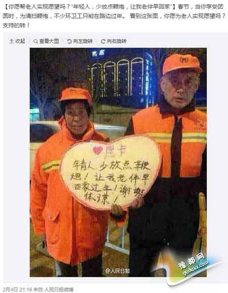 人民网北京2月5日电综合消息,昨天,一张呼吁少放鞭炮的图片在网络疯传,图片中的主人公是一对环卫工人夫妇,两人站在街头,手举一张心形卡片,上面写着“年青人,少放点鞭炮!让我老伴早回家过年!谢谢体谅!”人民日报法人微博也参与其中吗,呼吁:春节,当你享受团圆时,为清扫鞭炮,不少环卫工只能在路边过年。 看到这张图,你愿为老人实现愿望吗?支持的转!