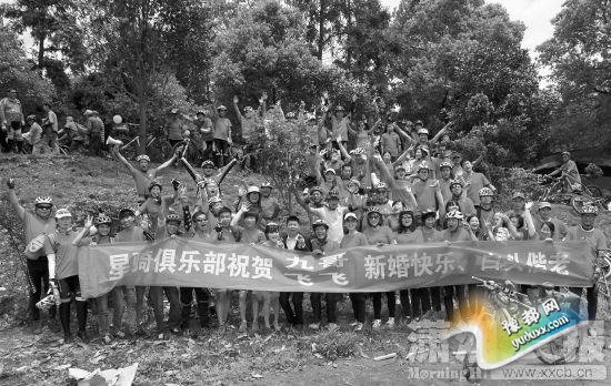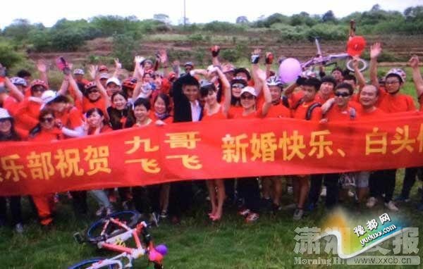 5月2日上午8点半,结束了前一天的狂风暴雨后,天空放晴,长沙山水芙蓉国际新城门口,星骑俱乐部的99名骑友穿着统一的红色上衣,衣服的背后写着“一心一意”,头戴红色安全帽,并且将自行车用气球和红色丝带装点,整装待发。俱乐部队长“不弃”(网名)说,选择99辆单车迎亲是有意义的,因为新郎曹睿在俱乐部的名字是“119”,取新郎名的最后一个数字,并且99也寓意着“长长久久”。