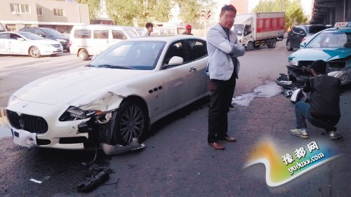 5月9日17时许,沈阳晚报、沈阳网记者赶到铁西区滑翔五金城南门,在马路边见到了事故车辆。出租车前保险杠脱落,左右大灯也被撞碎。而玛莎拉蒂轿车则左前脸受损严重,左侧保险杠和大灯均破损,被撞掉的保险杠压在了左车轮下。事故已经发生了几十分钟,仍然有众多围观者,“这撞一下又得撞进去几十万。”