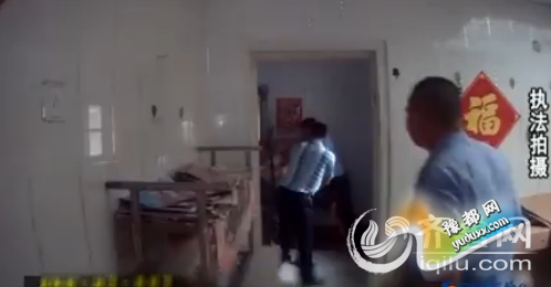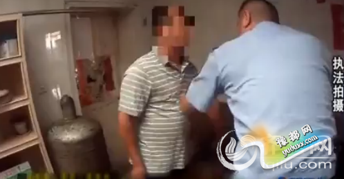 由于崔某情绪相当激动,执法人员临危不惧立马把崔某控制住(视频截图)齐鲁网6月29日讯 (山东台 张晨 刘名一)在烟台蓬莱市东关路南街30号,有一户居民在自家的平房内私自大量存储液化气,并给居民罐气,安全隐患巨大。接到举报后,蓬莱市城管大队联合公安、工商、消防等部门一起赶到了这家非法运输、储存液化气的窝点。然而就在执法的过程中,当事人却相当不冷静。