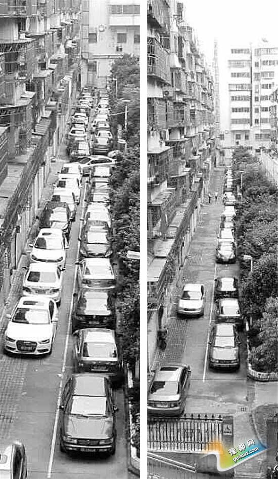 这是网友“兜兜的小鱼”发在宁波本地论坛上的两张对比图,讲的是江东一个老小区中特锦苑停车的故事。
