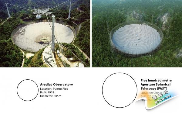 位于波多黎各的此前世界最大射电望远镜和正在兴建的FAST望远镜尺寸对比