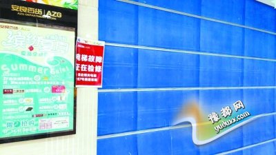 记者乘坐直达电梯来到六楼,走到手扶电梯口时看到,该楼层通往7楼的电梯口的卷闸门已经拉下,现场已经封闭,旁边贴着“电梯故障,正在检修”的告示。