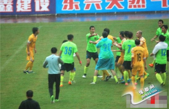 下半场香港明星队一名队员被铲倒在地,这也引发了冲突。