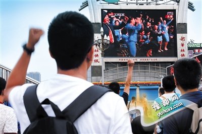 北京站振臂市民在北京火车站站前广场庆祝北京携手张家口获得2022年冬奥会举办权。新华社发