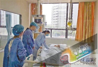 20日,杨志珍老人在医院重症监护室终于见到了自己的儿子龙岗(左2)和儿媳妇(左1)。 重庆晨报记者 雷键 摄重庆晨报记者 陈翔 实习生 张玥 报道