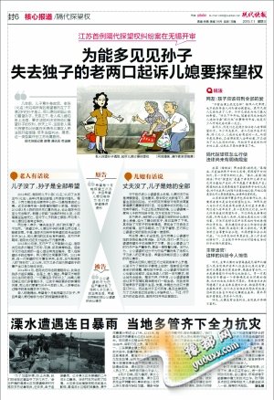 中秋节,是中国的传统佳节,更是一家人团圆的重要日子,随着中秋节成为国家法定节日,越来越多的人即使分隔两地,也会想方设法回家团圆。在无锡,有两个备受关注的家庭:为了延续亲情,失独的爷爷奶奶起诉儿媳讨要孙子的探望权;为了挽回亲情,7旬老母起诉女儿女婿要“常回家看看”。原本想通过法律维护的亲情,到底进展如何?中秋节前夕,现代快报记者走访了这两个案件的当事人。现代快报记者 薛晟
