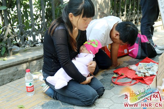 中午11点左右,郑州紫荆山立交桥下,一盒月饼、两位兄弟,还有一位年轻媳妇怀抱幼儿跪在路面。这一场景引人群纷纷层围观驻足,并向他们捐助爱心。