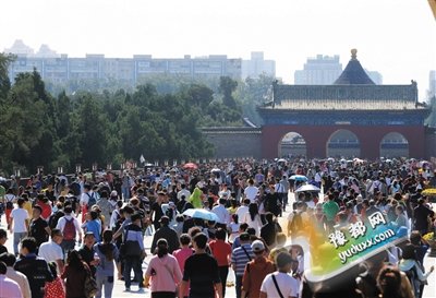 昨日,国庆黄金周第三天,天坛公园吸引大量游客前来观光游览。图/东方IC