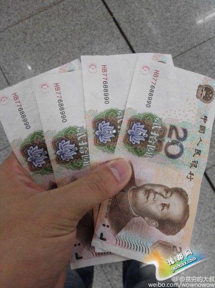 澎湃新闻(www.thepaper.cn)从@贫穷的大叔 发布的照片看到,4张20元的纸币编号均为HB77688990。
