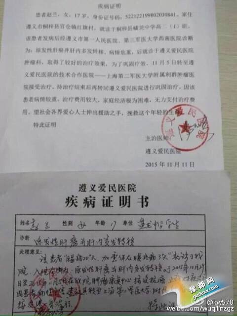记者了解到:赵兰,女,17岁,身份证号码:522122199802030841,家住桐梓县官仓镇,父母离异,孩子由父亲抚养,父亲没有稳定的经济来源,家里二爸是精神病人,长期生活不能自理,还有快满70岁的爷爷奶奶,赵兰平时学费都是靠政府和亲戚朋友帮助,这是个懂事认真的学生,平时节约用钱,就算之前出现病症了,因为家庭条件困难,也一直瞒着家里没有去医院检查,直到今年生病严重了,才查出来是肝癌。就是这样一个花样年华里聪明活泼的女孩,却因患上肝癌,离开了校园。