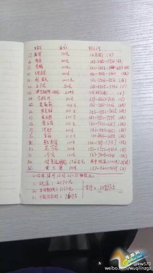 42:黄阅云 50 43:陈运彩 100 44:肖代琴 10 45:张小琴 10 46:刘 胜 10 47:陶丽香 10 48:李祖萍 1元 49:黄建伟 200 50:岳生国 100 51:朱 颖 10 52:李芯仪 50 52:王玉兰 100 53:袁 鸿 30 54:华忠德 100 55:姚玉玲 100 56:张学考 16.8 57:王 健 50 58:曾汝碧 10