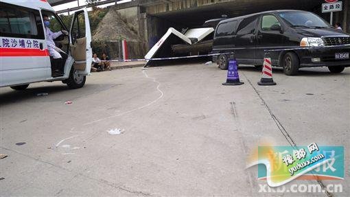 昨日中午12时许,新快报记者赶到现场,看到现场仍处于封锁状态,肇事货车歪斜停在高速路桥洞内,铁皮材质的车厢从中间折断,像“M”字形的帐篷一样搭在车上。邓子均的电动车倒在货车左前部两个车轮之间,已经严重损毁。在货车后面的路面上,一道十余米长、歪歪斜斜的车厢摩擦痕迹颇为醒目,旁边则是一条笔直的刹车线,桥洞入口处,限高为3.5米的龙门架右侧有数道摩擦痕迹。