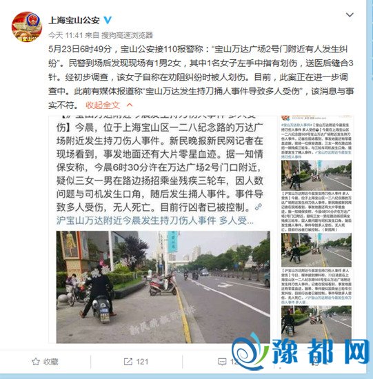 上海市公安局宝山分局官方微博截图《媒体报道上海万达发生捅人事件 警方:与事实不符》由河南新闻网-豫都网提供,转载请注明出处:http://news.yuduxx.com/shwx/401631.html,谢谢合作!