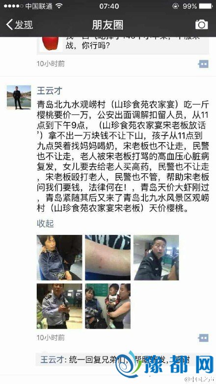 【网传青岛万元一斤天价樱桃 当地回应:不实】青岛市民王先生发文称,家人在崂山北九水遭遇万元一斤樱桃,并被果园主人打伤。青岛崂山宣传部门表示,此事因偷吃樱桃引发的争执冲突,一孕妇被推倒,目前正在医院检查,警方正在进一步处理。(记者王朝朋)