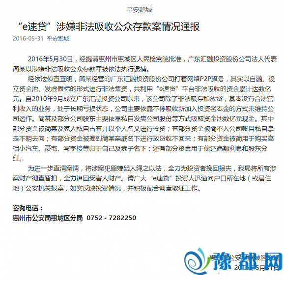 《惠州警方最新通报:正式逮捕e速贷创始人简彗星》由河南新闻网-豫都网提供,转载请注明出处:http://news.yuduxx.com/shwx/426290.html,谢谢合作!