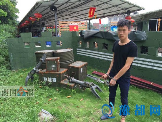 廖某在农庄草地上,现场指认拍摄用于装饰用的空汽油桶和空弹药箱。警方供图约前女友相见不成 发“弹药箱”扬言开炸