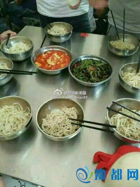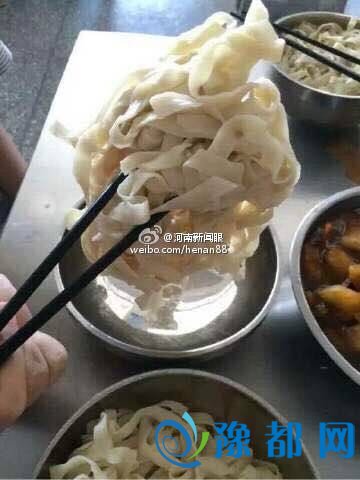 面条粘成一团。 来源:@河南新闻眼该校一名学生具体解释说,该校9月4日实行包餐制度,除走读生外3餐统一管理,一学期男生1500元女士1400元,8人一张桌子,1人1主食,共享2小盆菜。他称,饭菜不堪入目,味道差,且菜吃完就没了,“比如上了厕所,就没饭吃了”,还有高三女生吃到过钉子。