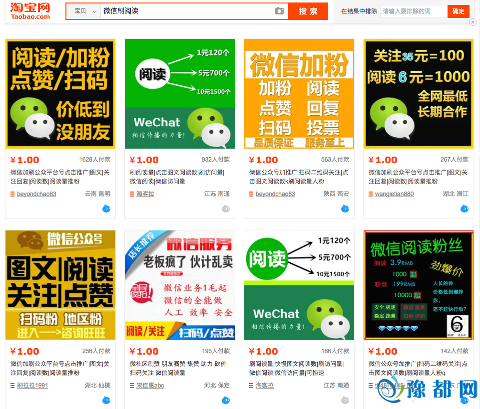 尽管如此,刷阅读量与粉丝数依然屡禁不止。第一财经记者在淘宝平台上搜索“微信刷阅读”关键字,出来的相关搜索信息多达19页。
