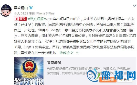 据@平安铜山 消息,2016年10月4日11时许,泉山警方接到一起涉嫌拐卖一名女孩(已怀孕)的报警。民警迅速赶到现场市中心医院,将相关当事人带至派出所做进一步处理。
