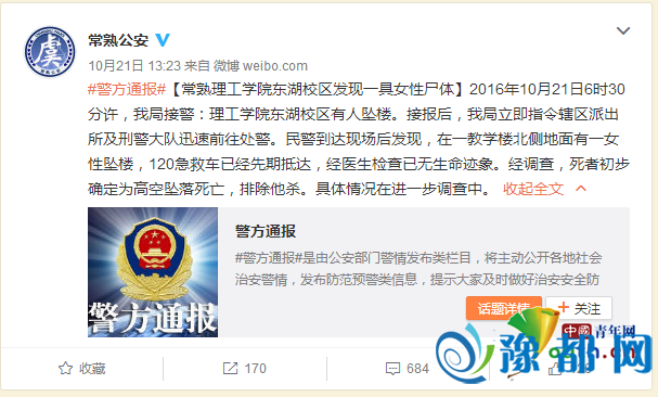 常熟警方微博通报截图。事发当天下午1点23分,常熟警方发布通报称:经调查,死者初步确定为高空坠落死亡,排除他杀。具体情况在进一步调查中。