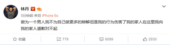 微博截图#林丹出轨# 【林丹发微博回应出轨 对家人表示道歉】@林丹 回应:做为一个男人我不为自己做更多的辩解但是我的行为伤害了我的家人在这里我向我的家人道歉对不起。