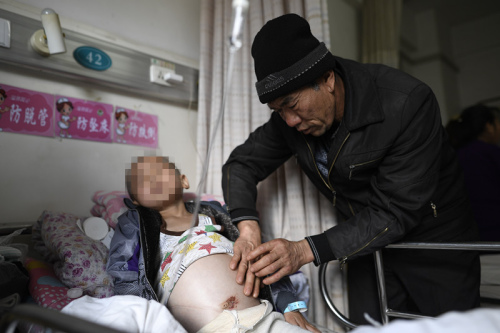 小帅大口喘着气,一阵阵剧烈咳嗽让他脸色发白,一只手插着针头输液,另一只手不时抚摸鼓胀的肚子。 韦亮 摄