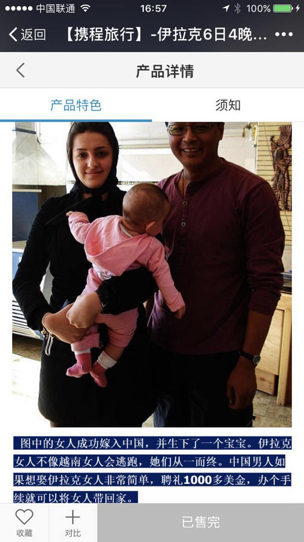 “伊拉克女人都很喜欢中国男人,她们认为中国男人成熟体贴,有责任感,对妻子很好,每天祈祷嫁到中国”、“中国男人如果想娶伊拉克女人非常简单,聘礼1000多美金,办个手续就可以将女人带回家”、““伊拉克女人说能嫁到中国,让她做什么都愿意”……上述颇具鼓动性的言辞,是携程网上旅行项目“伊拉克6日4晚自由行-幸福之旅”的广告语。近期在网上引发热议。