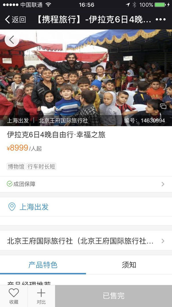 《组旅行团去伊拉克找媳妇?携程:有不妥 已下架》由河南新闻网-豫都网提供,转载请注明出处:http://news.yuduxx.com/shwx/776957.html,谢谢合作!