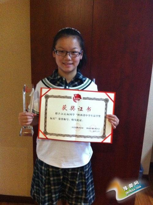 2014年7月,江欣桐获得“陕西省中学生品学奖标兵”。 受访者家长供图
