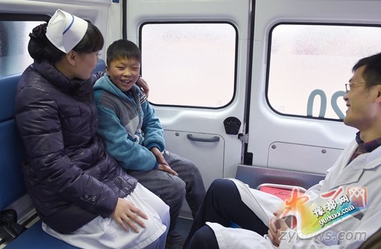 就在这一天,在长白村,还有一场感人的“爱心春雨”,村里的“紫面男孩”坐上专程为他而来的郑州市第七人民医院的救护车,他要去做第二次心脏手术了,过几天,再回来的时候,他就是一个完全健康的大男孩了。当记者问起他康复后的最大愿意是什么时,这个天真的男孩笑笑说:“我想上体育课,我想去打工……”一句话说酸了现场每一个人的心。