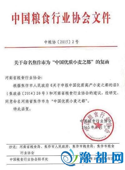 26.2015年8月7日,中国粮食行业协会致函河南省粮食行业协会,同意命名焦作市为“中国优质小麦之都”。