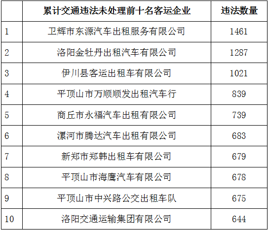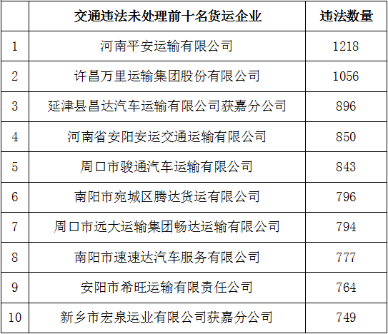 豫都网讯(记者 胡皓斌)在第23个“交通违法曝光日”,河南交警总队对客货运以及危化品运输企业累计交通违法未处理排名前十的企业进行曝光。